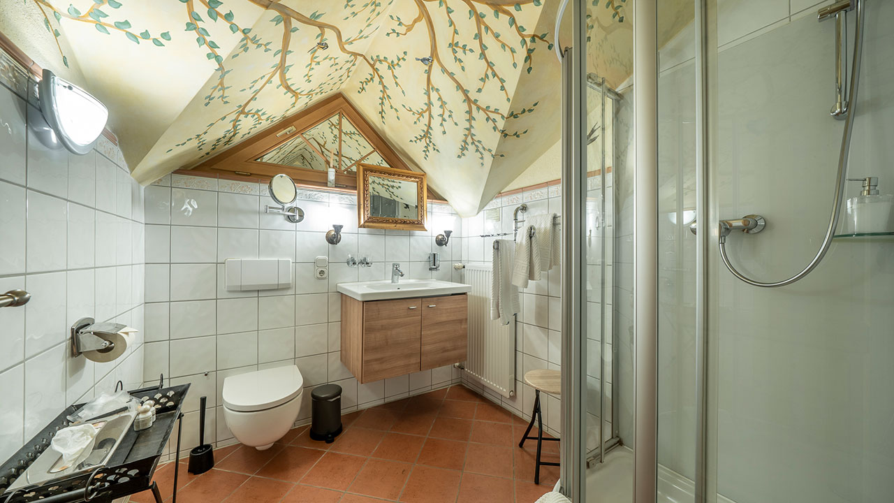 Unser Standard-Doppelzimmer im Dachgeschoss verbindet kreatives Design mit liebevollen Details – ideal für Paare, die das Besondere suchen. In sanften Blau- und Grüntönen gehalten, empfängt Sie ein Raum voller Ruhe und Leichtigkeit. Ein echtes Highlight ist die kunstvolle Bemalung des Badezimmers, die Auge und Seele gleichermaßen verwöhnt. Auf 20 m² erwartet Sie ein Rückzugsort mit Charme, Gemütlichkeit und dem gewissen Etwas.