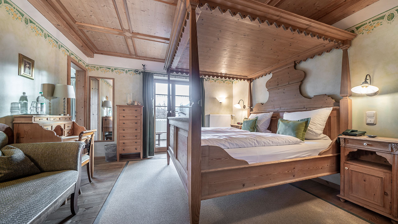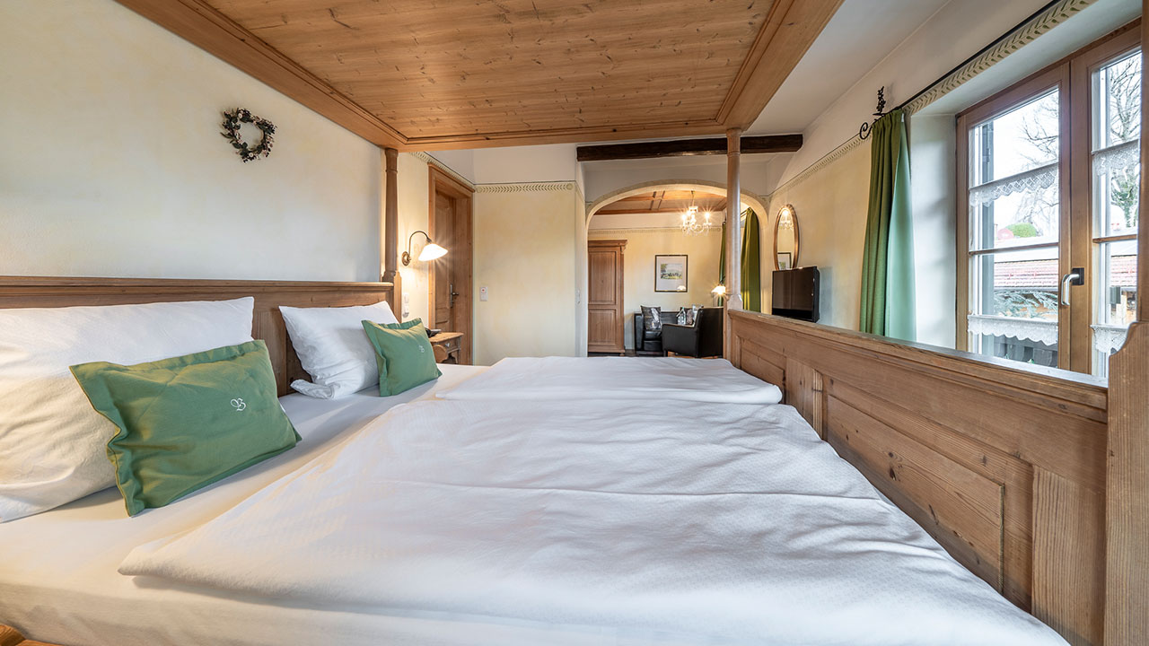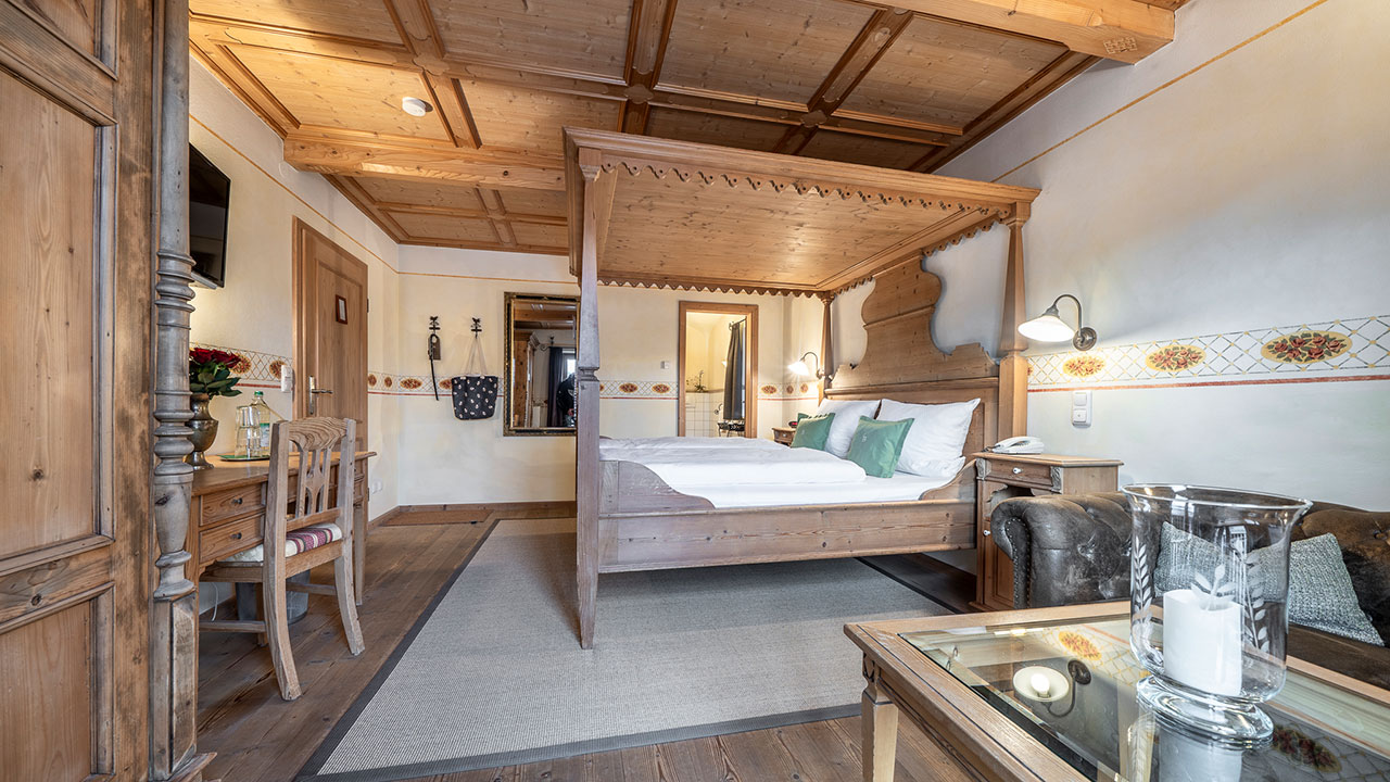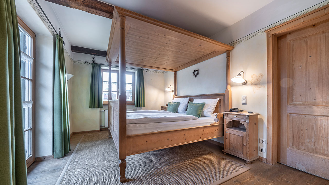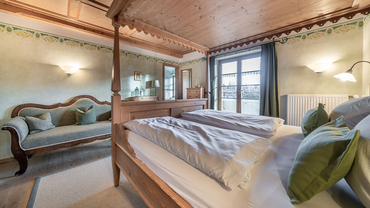 Dieses Doppelzimmer lädt zum Verweilen ein – mit sanften Grüntönen, warmem Holz und einem Himmelbett zum Träumen. Natürliche Farben und liebevolle Details schaffen eine wohltuende Ruhe, die Sie vom ersten Moment an spüren werden. Ein stilvoller Sekretär bietet Platz für kleine Gedanken oder Urlaubsgrüße an die Lieben. Ein Zimmer, das Geborgenheit schenkt – und Raum für echte Auszeiten.