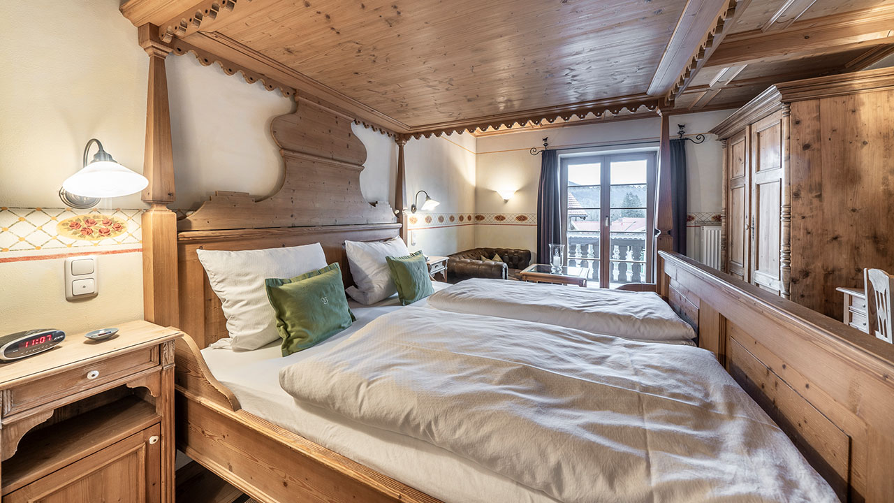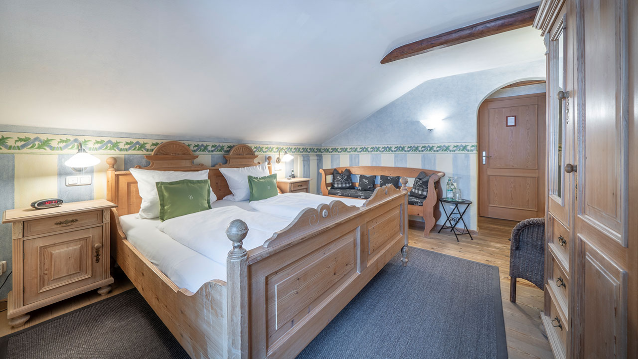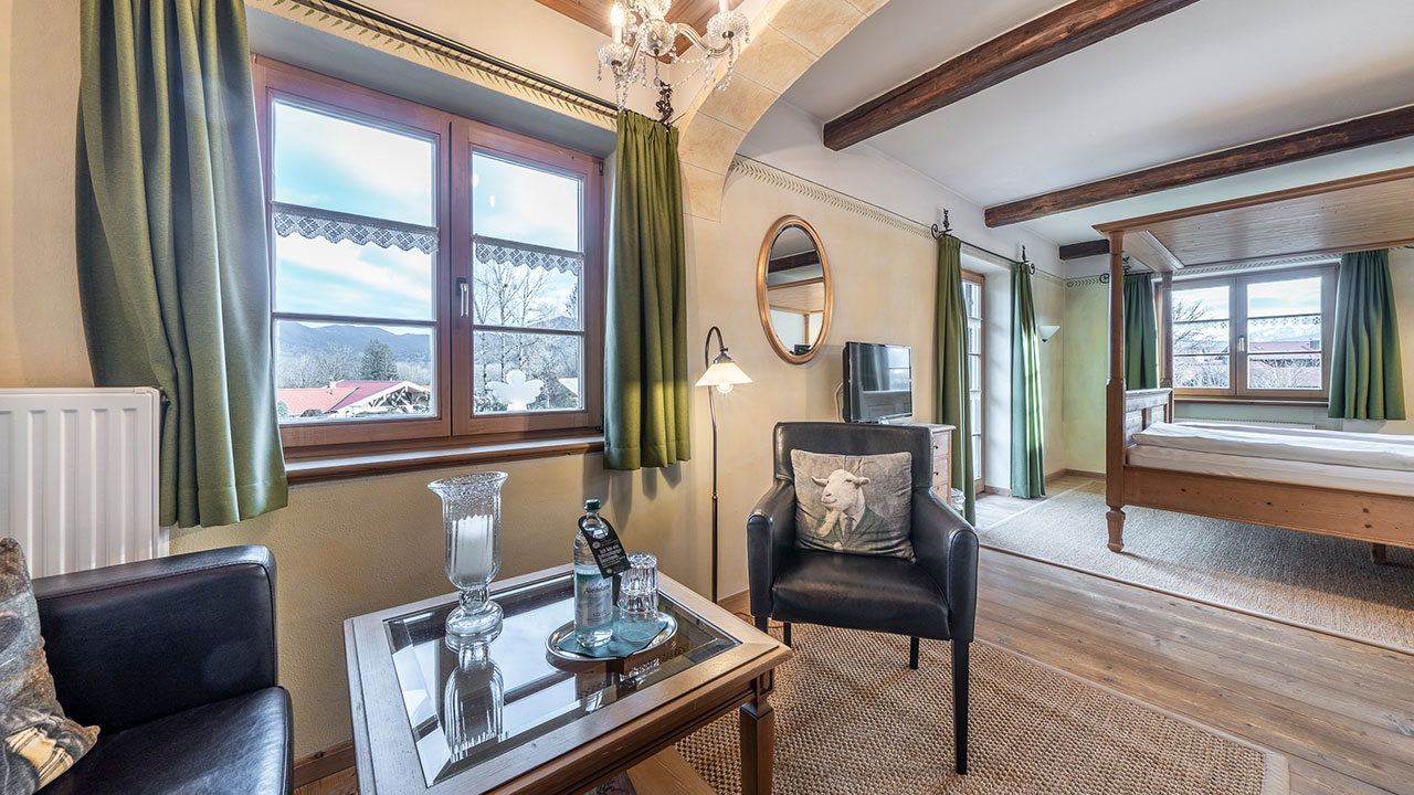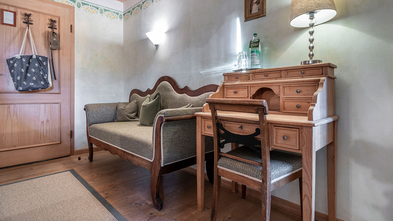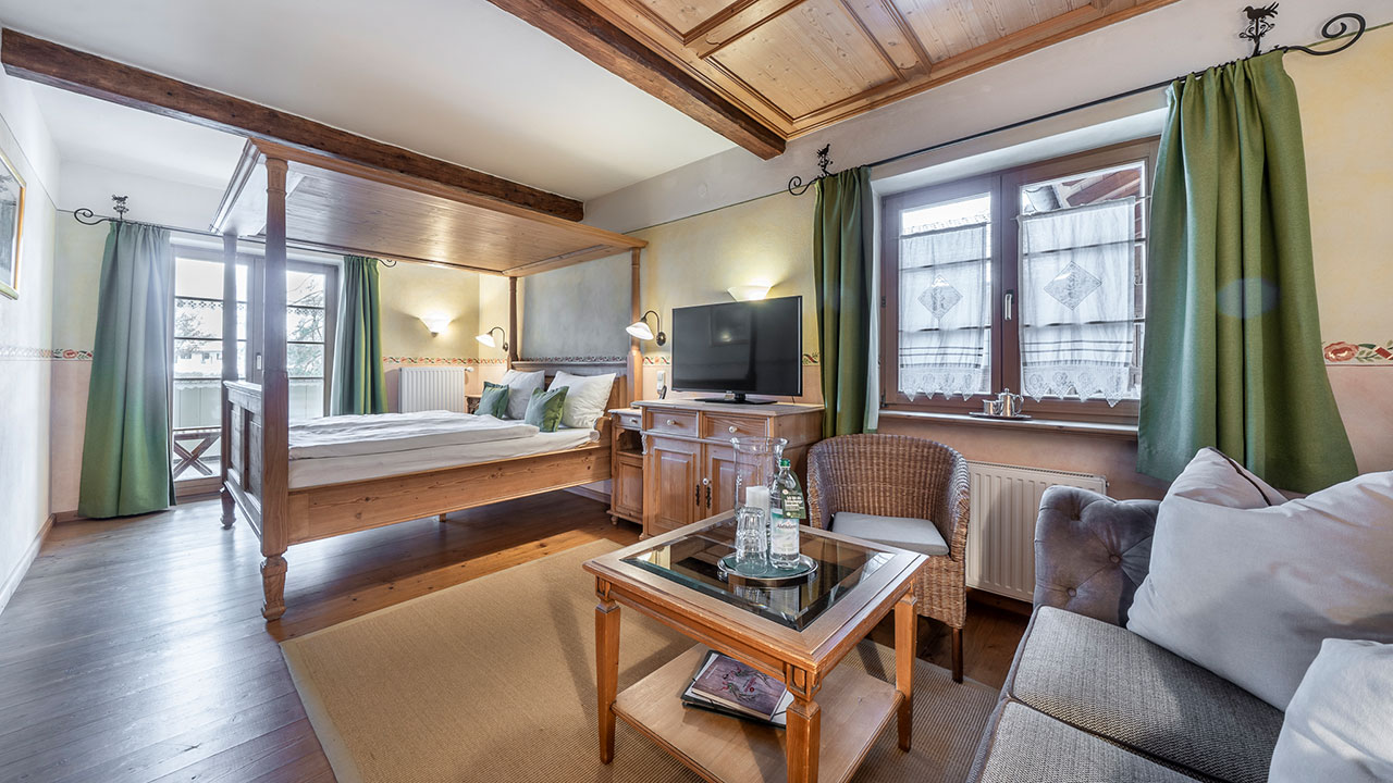 Dieses Doppelzimmer lädt zum Verweilen ein – mit sanften Grüntönen, warmem Holz und einem Himmelbett zum Träumen. Natürliche Farben und liebevolle Details schaffen eine wohltuende Ruhe, die Sie vom ersten Moment an spüren werden. Ein stilvoller Sekretär bietet Platz für kleine Gedanken oder Urlaubsgrüße an die Lieben. Ein Zimmer, das Geborgenheit schenkt – und Raum für echte Auszeiten.